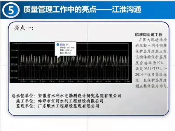 8月17日,引江濟淮集團公司召開8月份質量安全視頻會,會上,蚌埠江河公司承建的臨淮崗魚道工程混凝土鋼筋保護層作為亮點在視頻會上交流。